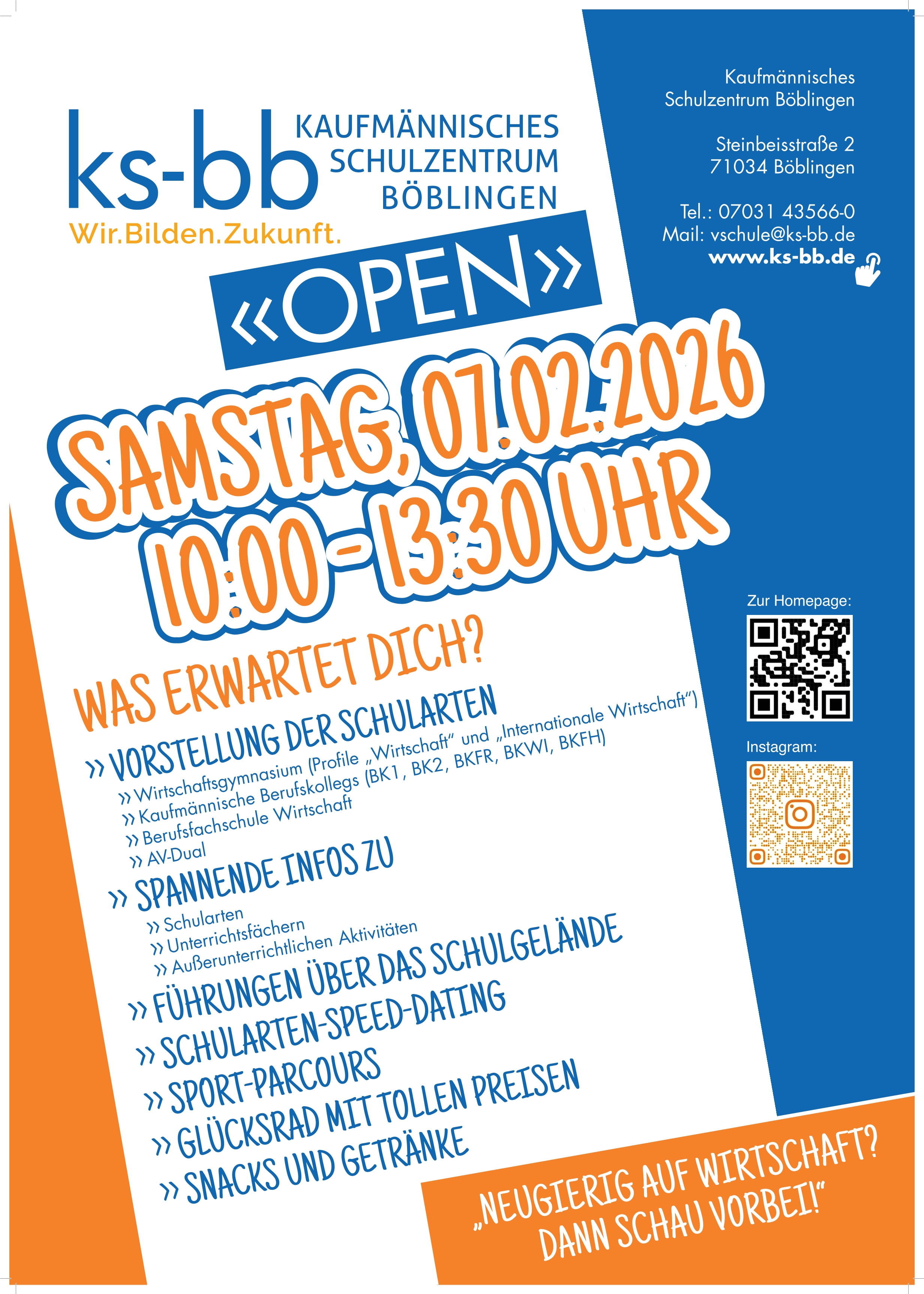 Das Kaufmännische Schulzentrum Böblingen lädt zur Informationsveranstaltung „ks-bb open“ am Samstag, dem 07.02.2026 von 10 Uhr bis 13.30 Uhr in seine Räumlichkeiten in die Steinbeisstraße 2 in Böblingen ein.